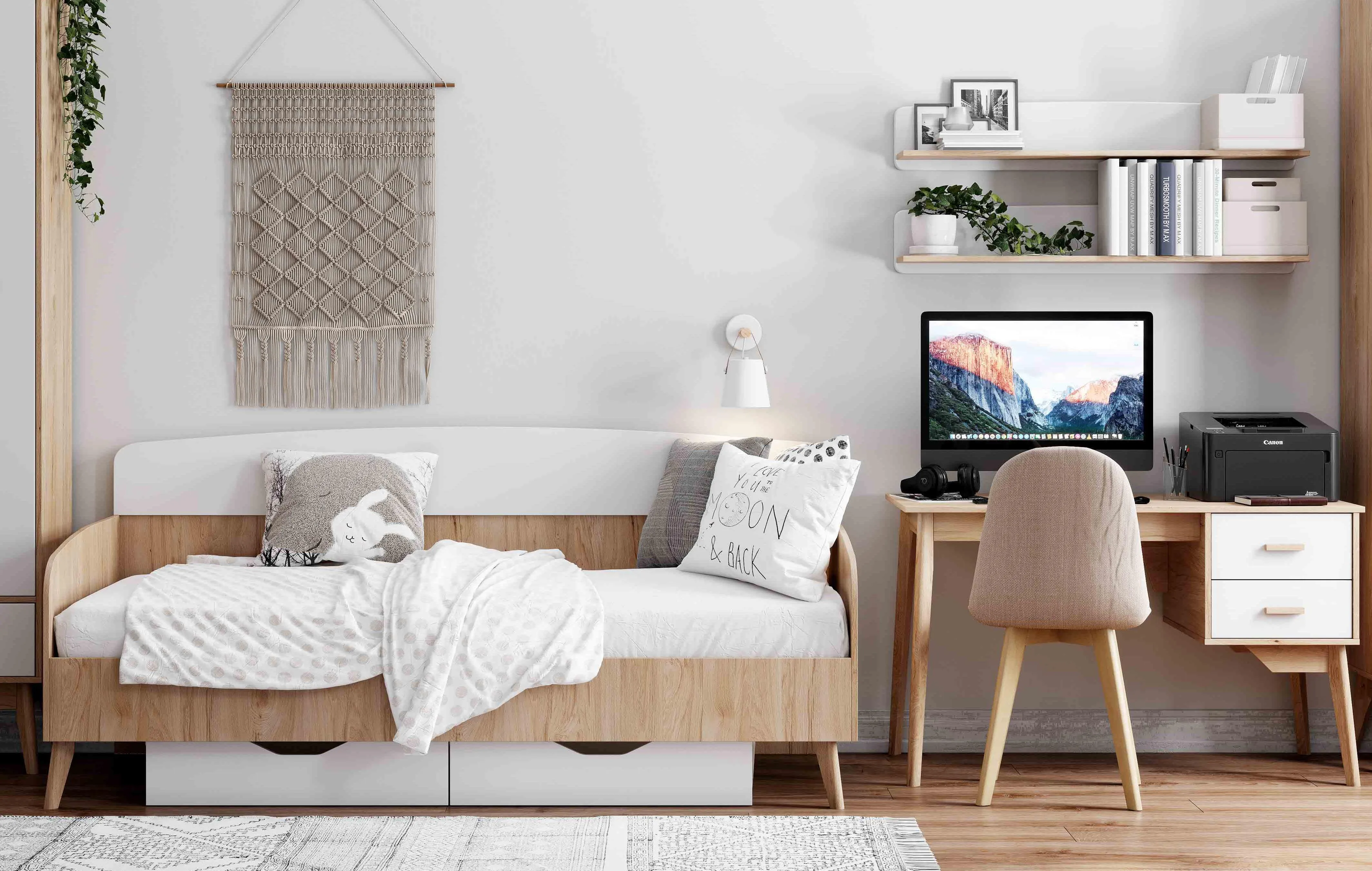 Она включает в себя различные элементы: шкаф, стол, стеллаж и кровать, которые можно комбинировать в зависимости от потребностей и предпочтений.