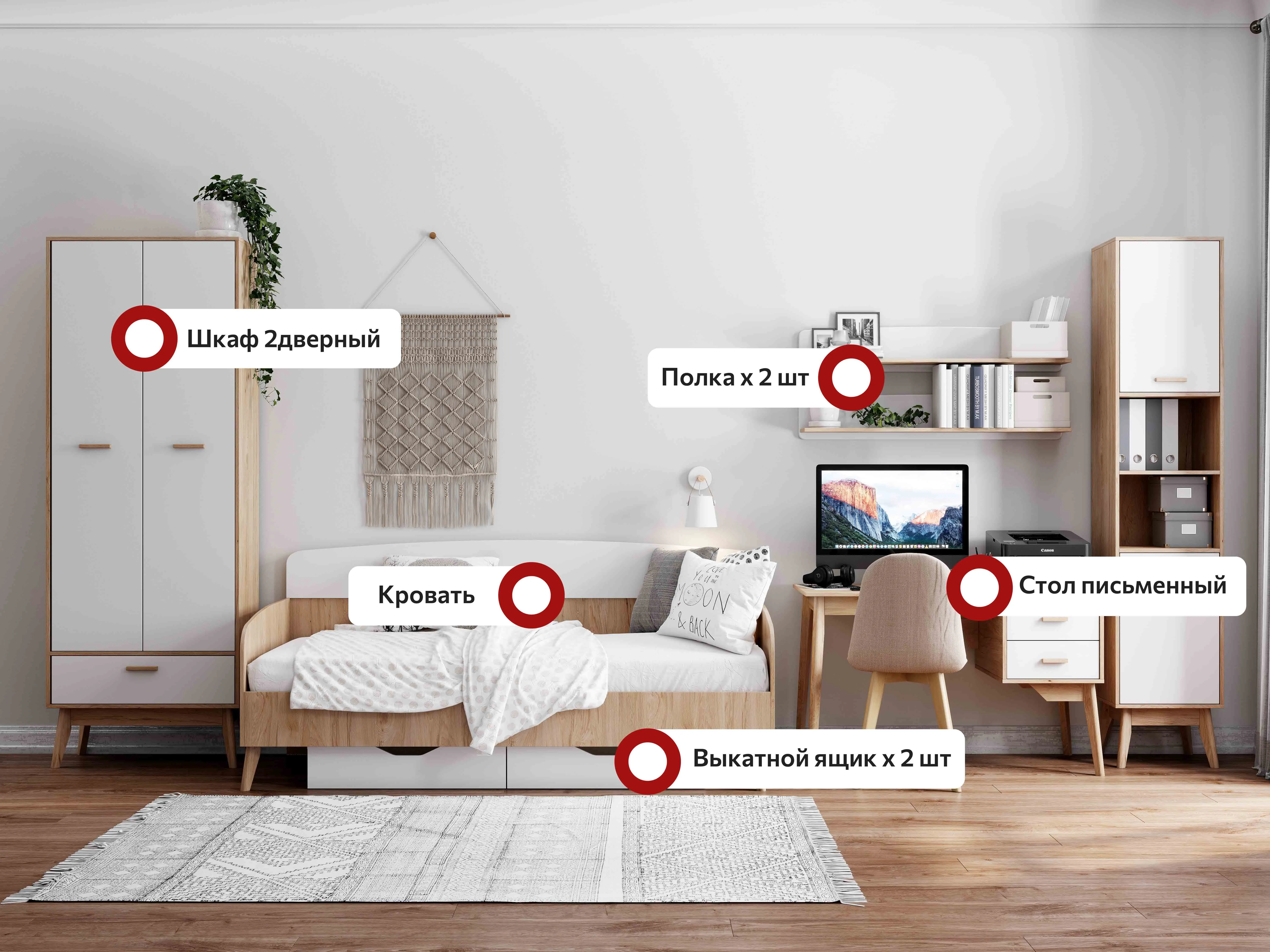Она включает в себя различные элементы: шкаф, стол, стеллаж и кровать, которые можно комбинировать в зависимости от потребностей и предпочтений.